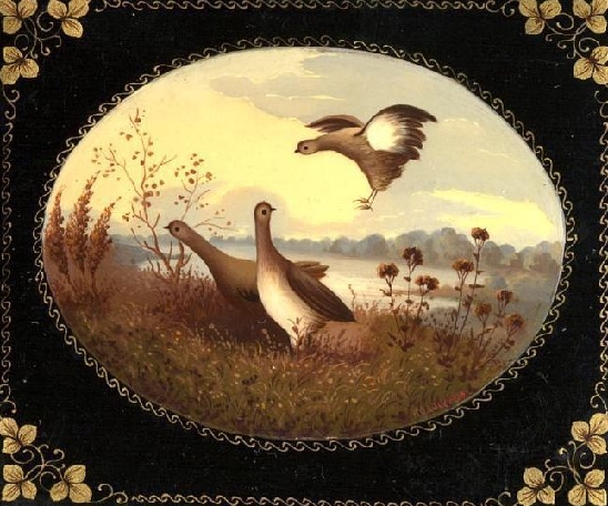 Koloskyova takes this composition from a well known 1959 painting by Sergey Petrovich Rogatov titled 'Summer Landscape With Partridges', but makes it uniquely her own with her keen sense of natural light and blended pigments. The rich maple-brown of the foliage is painted in many hues to bring out the finest botanical detail. (We venture to say that, "If Koloskyova, with her strong feeling for nature, were a resident of North America, she would undoubtedly be a member of the Sierra Club ...")